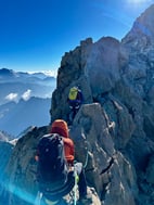 Here, at around 3,400 meters, the long and graceful ridge begins — never too easy, never too exposed — guiding climbers to one of the most panoramic summits in the region.